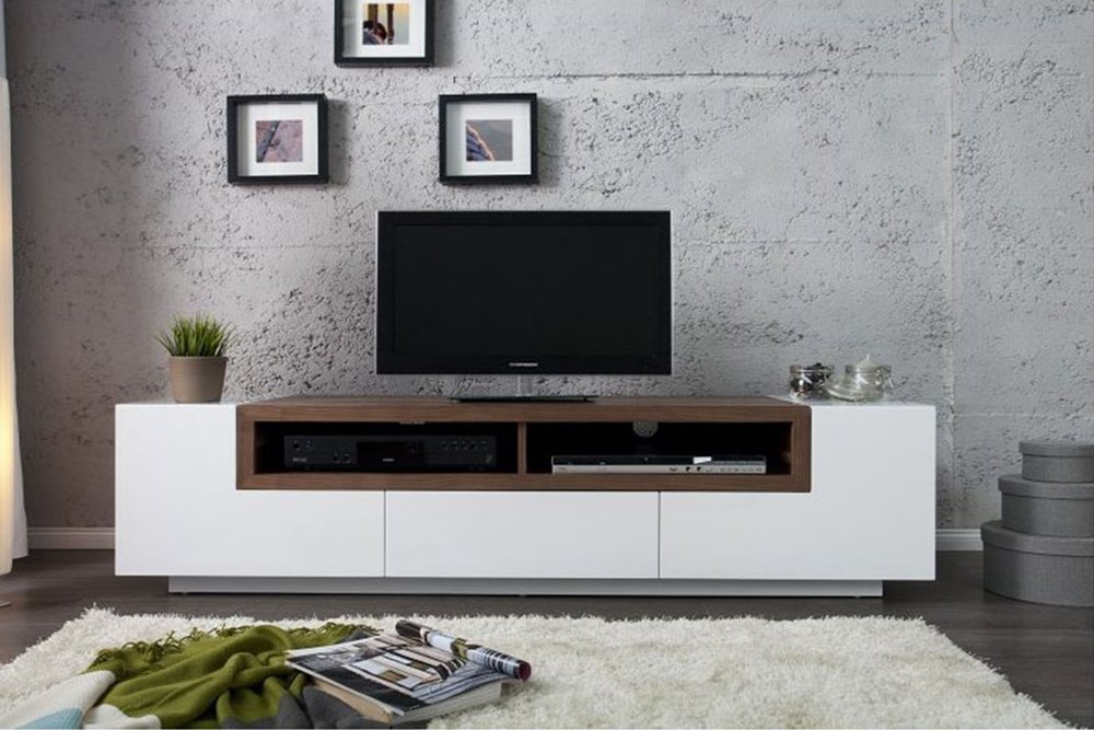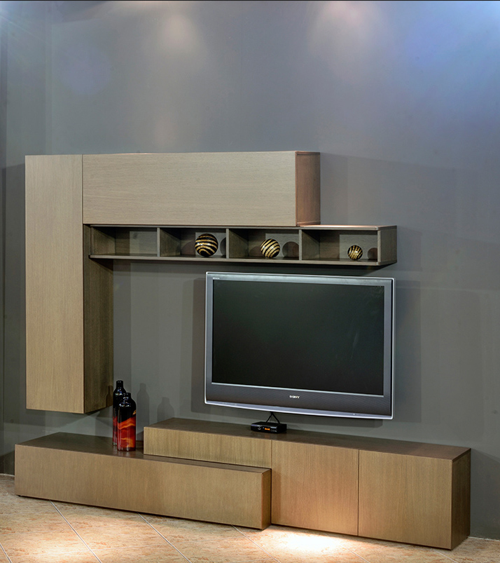 Σύνθεση τηλεόρασης σχέδιο Magic από φυσικό ξύλο δρυς σε μοντέρνα γραμμή. Κρεμαστά ντουλάπια με πορτάκια, κρυστάλλινα ράφια και πλάτη πίσω από την τηλεόραση.